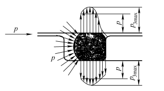 Because of the pre-seal, the O-ring is in close contact with the sealed smooth surface and the bottom surface of the groove, so that when the fluid enters the groove through the gap, it can only act on one side of the O-ring. Under the working condition, the fluid through the gap to one side of the O-ring pressure is further increased, the O-ring pushed to the other side of the groove and squeezed into a D-shaped state, and the pressure is transmitted to the seal contact surface. Therefore, the seal pressure is actually greater than the fluid pressure applied due to the initial interference pressure action. Pressure distribution of contact surface under o-ring working condition is shown in FIG. 3.